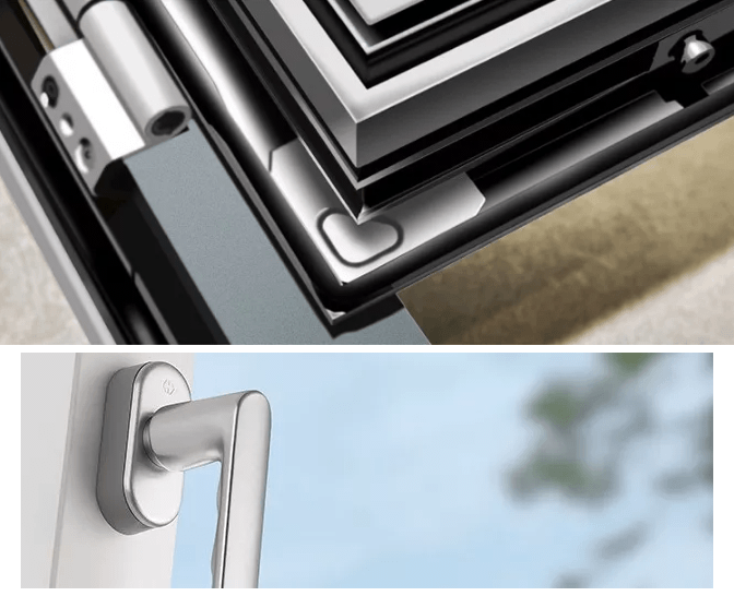 鋁合金表面經陽極電化處理后,可呈現古鉛肝銅、金黃、銀白等色,可任意選用,經過氧化表面光潔閃亮。窗扇框架大,可鑲較大面積的玻璃,讓室內光線充足明亮,增強了室內外之間立面虛實對比,讓居室更富有層次